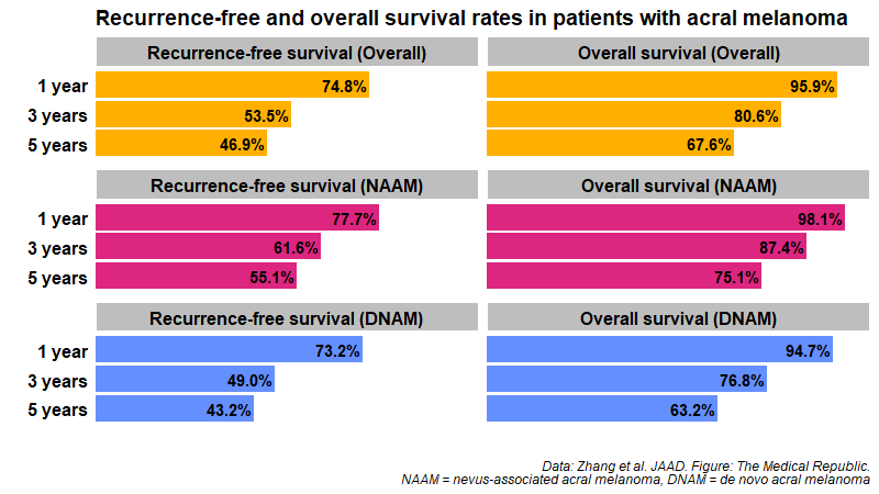 Acral melanoma, which appear on the palms of the hands, the soles of the feet or under the nails, is typically associated with a poor outcome. But beyond this, little is known about whether nevus-associated acral melanomas (NAAMs, which develop from pre-existing benign lesions) have a different prognosis compared to de novo acral melanomas (DNAMs, which appear spontaneously).